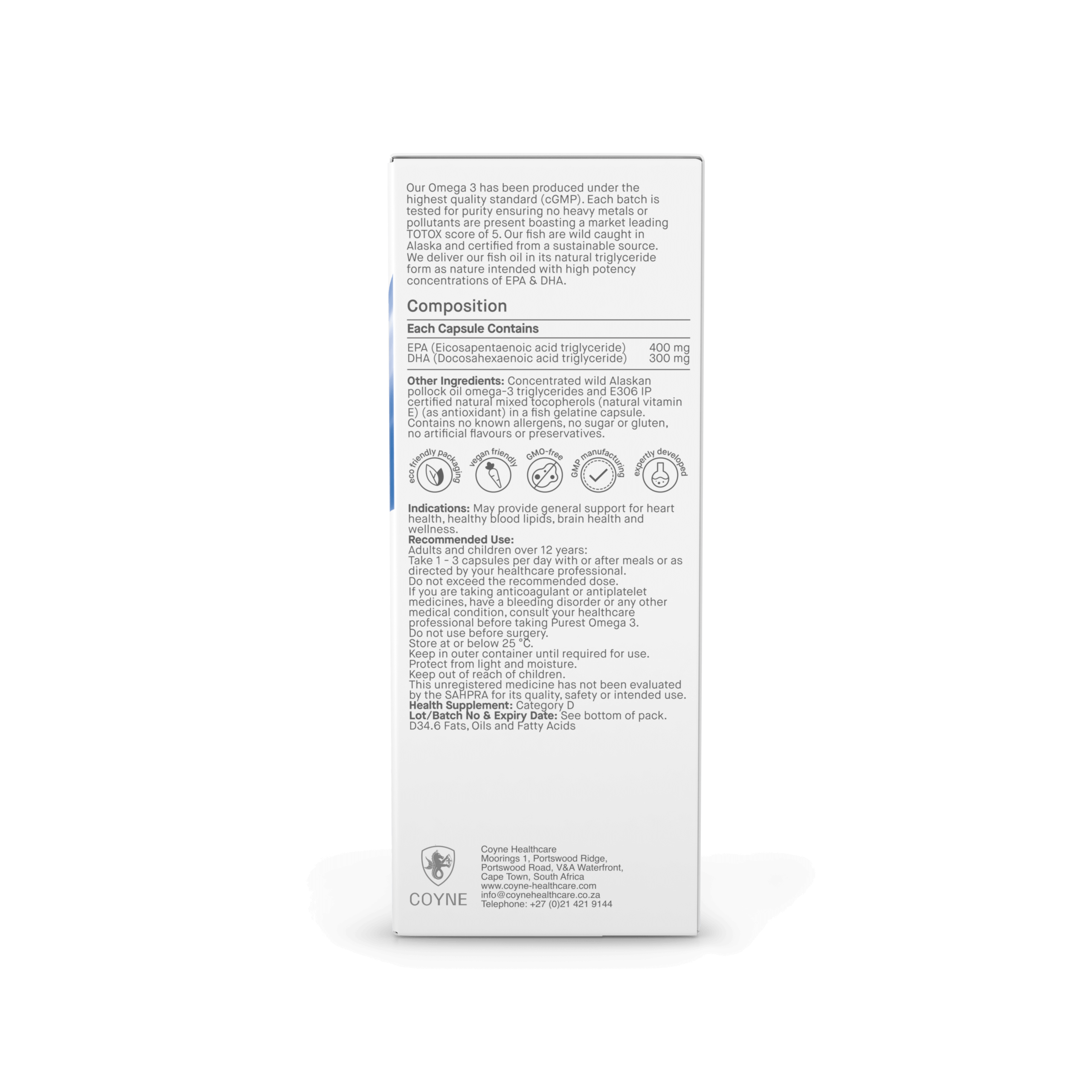 In developing Purest Omega Coyne Healthcare have collaborated with a world leading authority and expert in Omega 3 production. Their oil boasts the world’s leading TOTOX score, which measures oxidation, meaning they guarantee you the freshest and purest Omega 3 on the worldwide market. Delivered in its natural Triglyceride form (TG) as nature intended, they deliver a potent dose of EPA and DHA in each capsule.